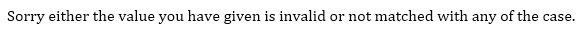 System.out.println("Sorry either the value you have given is invalid or not matched with any of the case.");