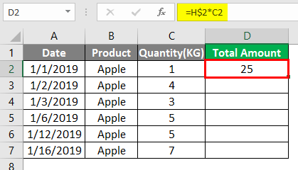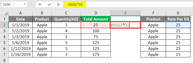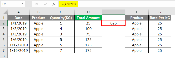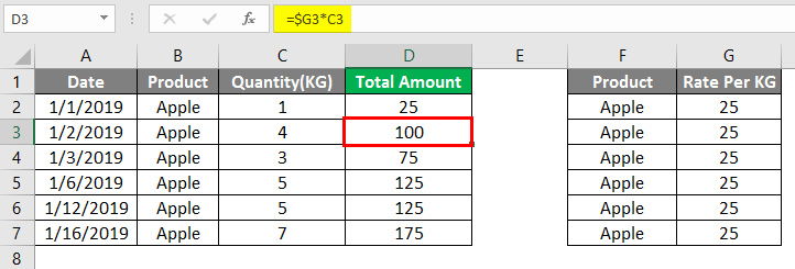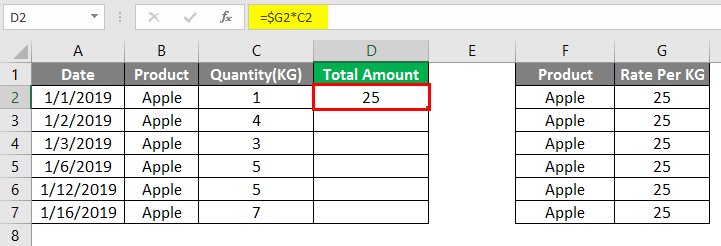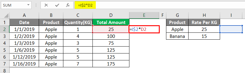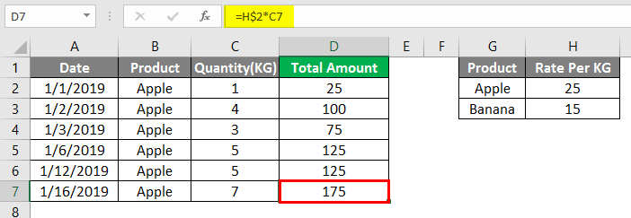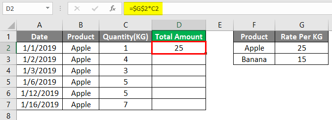 So when we insert the formula in cell D2, we need to ensure that we lock cell H2, which is the Rate Per KG for Apple. So the formula to enter in cell D2 =$G$2*C2.