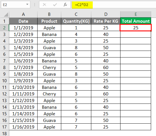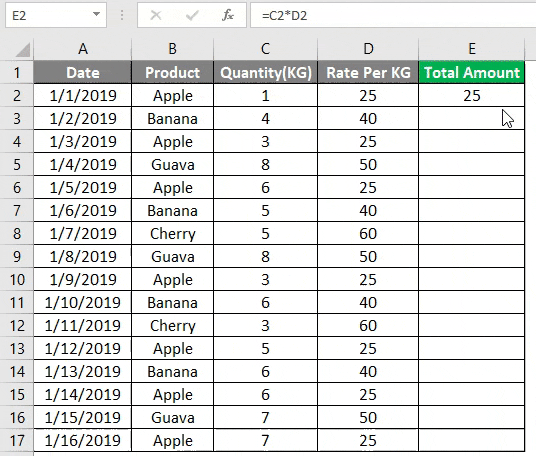 There is Quantity sold in column C and Rate per KG in Column D. So to arrive at the Total Amount. You will insert the formula in Cell E2 = C2*D2.