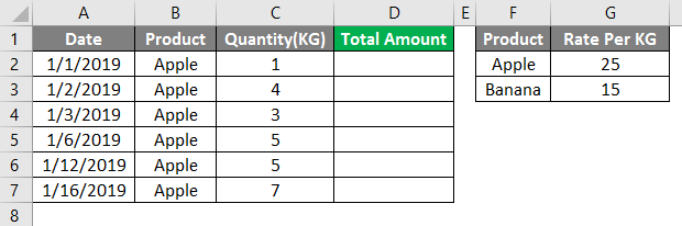 We will take a similar example of Example 2, but now we have the rate per KG for an apple in each line of Column G.