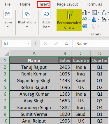 - First, select the data, then go to the Insert tab and select Recommended Chart Tab.