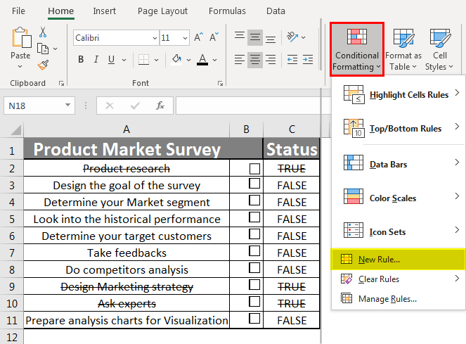 Based on your preference, we can apply conditional formatting by distinguishing the list based on a different background or font color to the checked items (TRUE values) or by strike format. To use below the strike-through option.