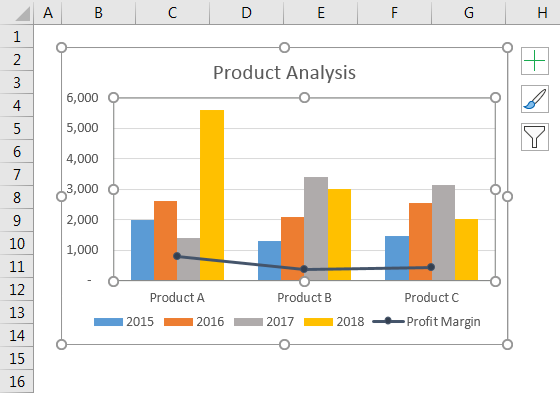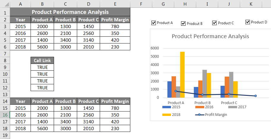 Now make a copy of the table (columns P to T) and write the formula =IF($C$10,$C4, NA()). This means that if Cell C10 is true, the table will contain a C4 value, i.e., 2000 for Product A in 2015, or it will return NA. Whenever the checkboxes are checked, they will have values associated, which will be reflected in a chart. When checkboxes are unchecked, the chart won’t show any values. This condition will make or chart interactive.