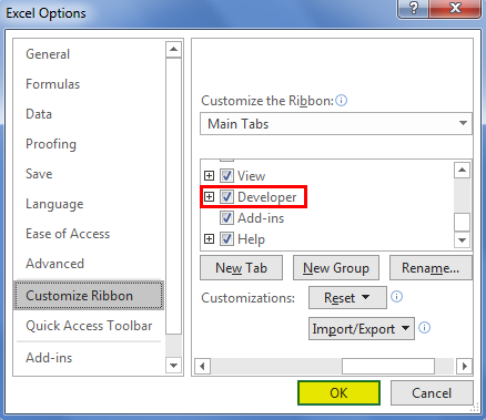 Enable the Developer tab on the ribbon before you start creating a checklist. Go to the Excel Options menu, and select Customized Ribbon.