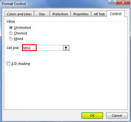 b. In the Control tab option of the Format Control dialog box, select a cell in an Excel sheet where you want to link this checkbox. In this example, I have selected cell “c2” to create a link.