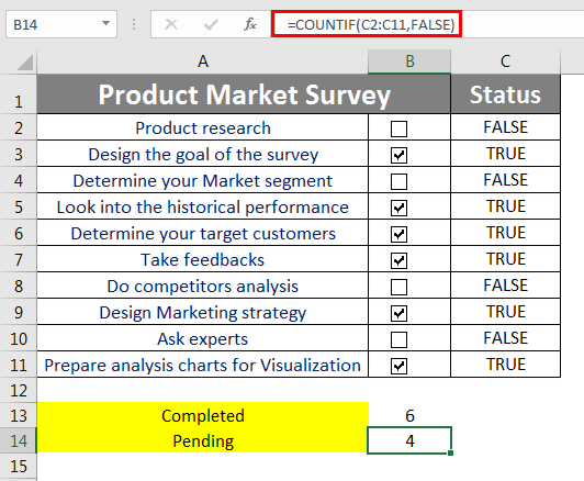 A checklist can use in Several Ways. To keep track of the number of tasks Completed/Pending:- Using the countif formula, you can see how many tasks have been completed or are pending.