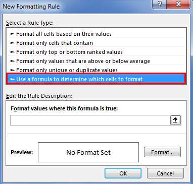 First, select the listed Product market survey. Go to the conditional formatting option available in the Home tab. Then go to the New Rule option. In the New Rule dialog box, select a rule type, and select the last option, “Use a formula to determine which cells to format”.