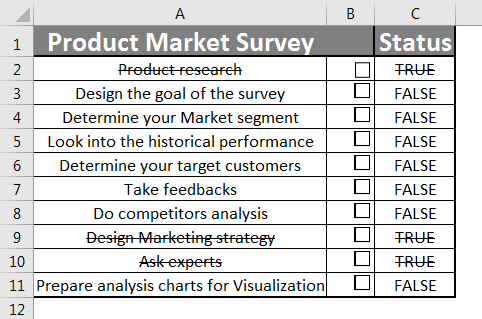 One can strike out an option from a checklist when completing our task. Below is an example where task such as Product research, designing market strategy & asking for expert opinion has been completed and longer needs to be considered in the future. You can accomplish this by using the conditional formatting feature in the checklist.