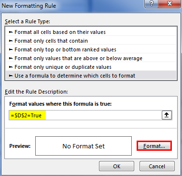 In the Edit, the Rule Description portion, enter the formula: =$D3=TRUE. And Click on the Format button.