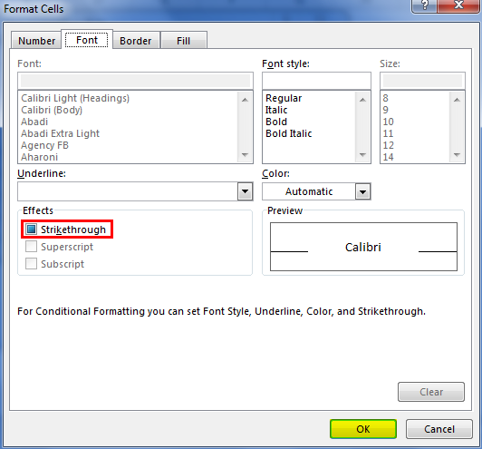 In format cells, the dialog box selects the Strikethrough option. Note you can also choose font style & background color as per your choice.