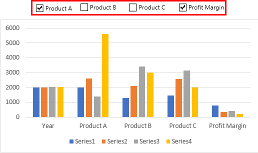 Checkboxes or checklists can also be used with charts or tables to make it more interactive. In the example below, I have shown products A, B & C comparison with respect to the profit margin.