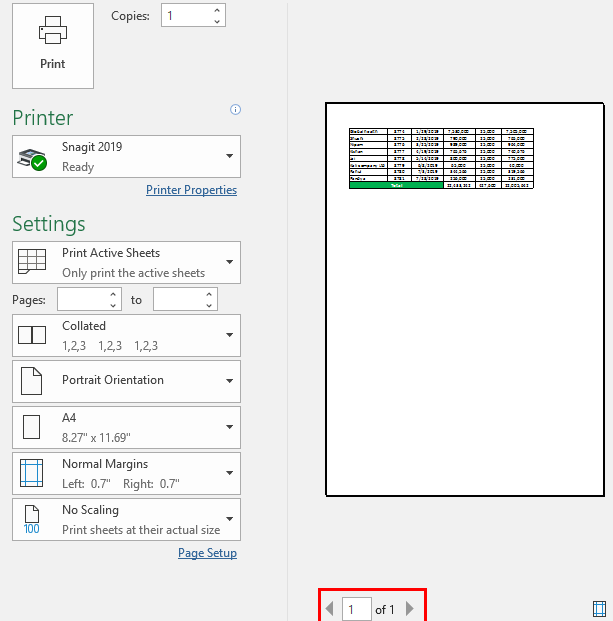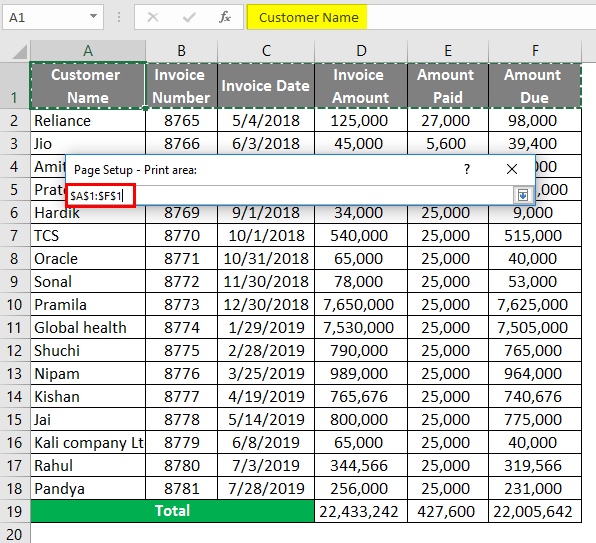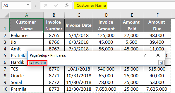 - Now click on the “Print Preview” option on the page setup as shown in the below screenshot to see the Print Preview. As you can see in the below screenshot, the print area is from Row 11 to Row 20, with the column headers in Row 1.