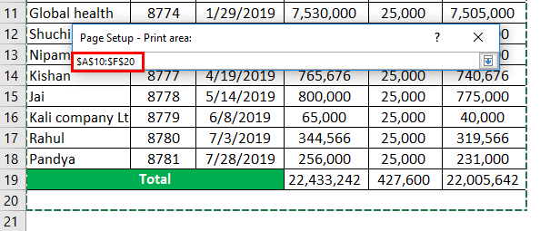 - If you want to print Row 11 to Row 20, select the Print Area from Row 11 to Row 20.