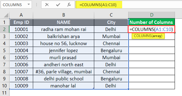 Let’s understand how to use the COLUMNS Formula in Excel with some examples.