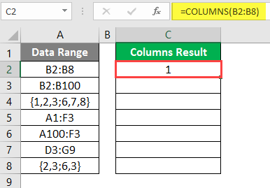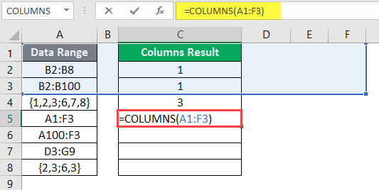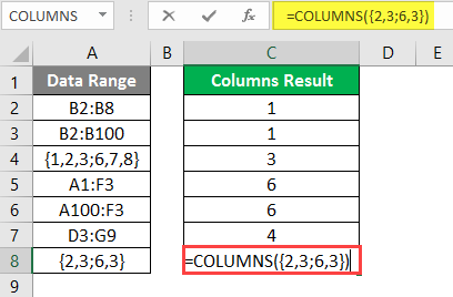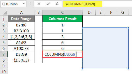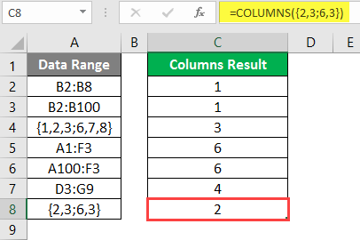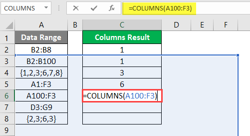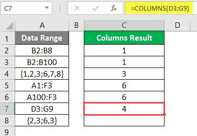 As an example, let’s assume there is an array “B2:F7”; then, in the COLUMNS function (=COLUMNS (B2:F7)) will return 5. It means 5 columns exist in the range of B2 to F7.