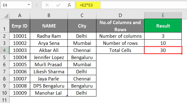 Now just multiply the cells data of the total number of columns and the total number of rows in the E4 to find out the total number of cells in the table.