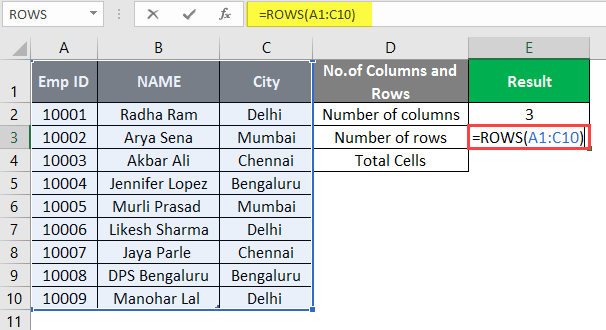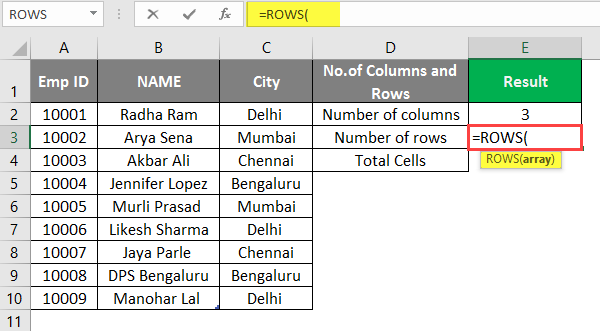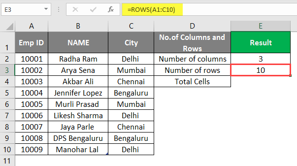 Click on cell E3 and apply the ROWS Function to count the total number of rows in the table.