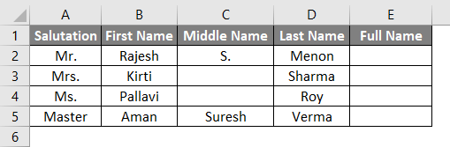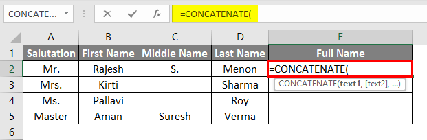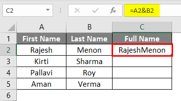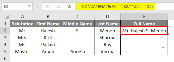 In the above screenshot, we have separated the First and Last name with space. And used space as text, so to add it to the formula, we need to frame it with inverted commas/double quotes (“”). Any type of text which types manually should be framed with inverted commas as we did for space between the First and Last name.
