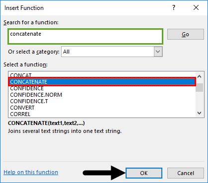 This is a common function; it will probably be located under the ALL category. Once we click on it, we will get an Insert Function window. From there, search for CONCATENATE function and click on Ok, as shown below. the
