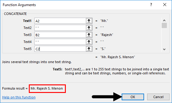 After that, we will get the Function Arguments window. In that, select the cell in proper sequence the way you want to see the First and Last name, separated by space (“”). There is no need to add inverted commas for space, as it will automatically consider them once we move to the next cell. Once done, click on Ok.