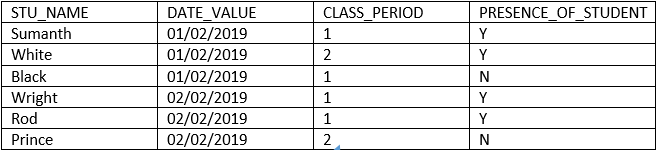 Here in the above example, we are deriving the attendance of students present in each day. Here the columns “STU_NAME”,” DATE”, “CLASS_PERIOD” and “PRESENCE_OF_STUDENT” individually won’t be able to fetch a row as they consist of duplicates.