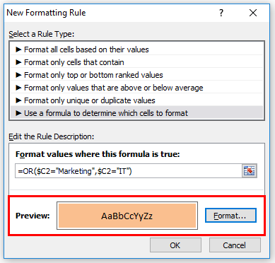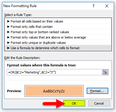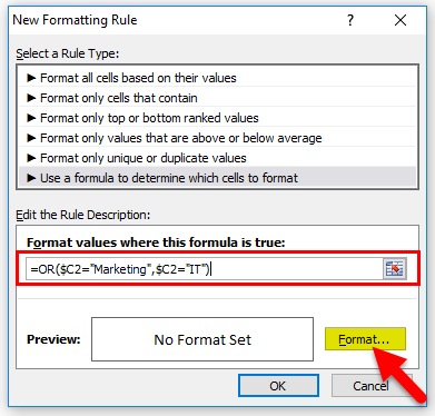 Step 4: In the formula section, enter the formula =OR($C2=”Marketing”,$C2=”IT”) and click on the Format button.