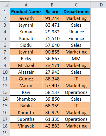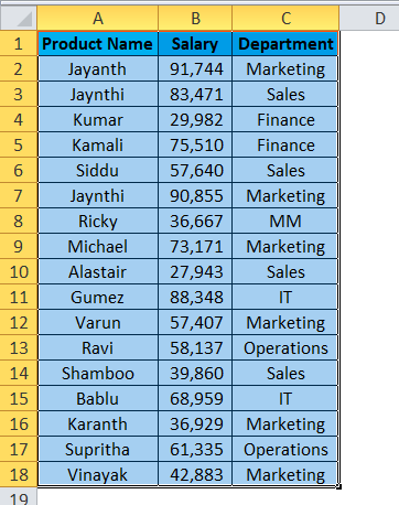 We have an employee database with names, salaries, and departments. Here we want to highlight the departments of Marketing and IT. We must apply the formula in the conditional formatting tab to do this task.