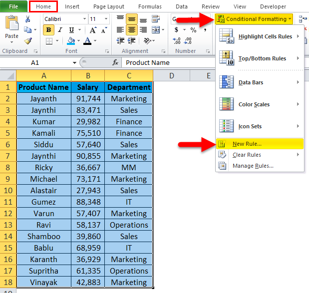 Step 2: Select the entire data. Now, go to Home, click Conditional Formatting > New Rule.