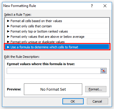 Step 3: In the New Formatting Rule window, select Use a Formula to determine which cells to format.