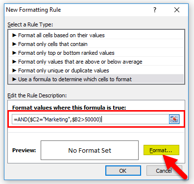 Step 4: Under the formula section, enter the formula =AND($C2=”Marketing”,$B2>50000) and click on Format.