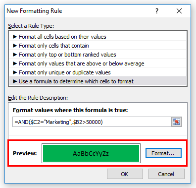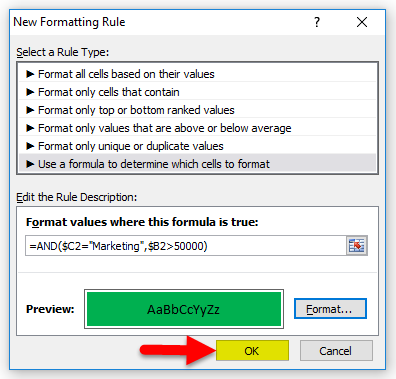 The above formula will highlight all the rows with Marketing and salary of more than 50,000.