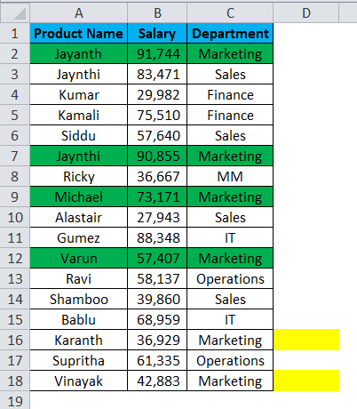 In the above image, the marked yellow rows are also Marketing, but the salary is less than 50,000, so AND function excludes these rows from highlighting.