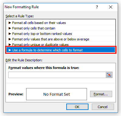 Step 3: The New Formatting Rule window will open; select Use a formula to determine which cells to format.