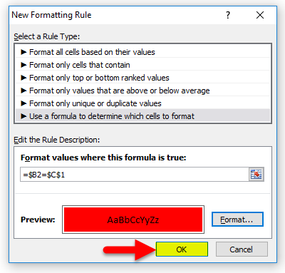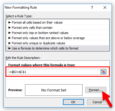Step 4: In the formula section, enter the formula =$B2=$C$1 (as shown in the image below) and click Format.