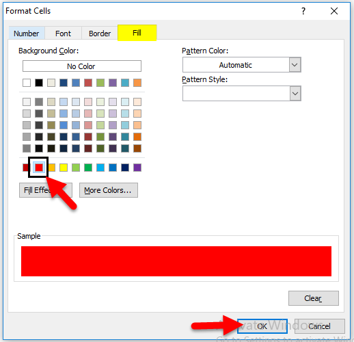 Step 5: In the Format Cells window, click the Fill option, select the formatting color, and click the OK button. The preview section will display the color you choose.