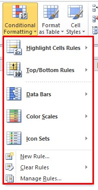 The Conditional Formatting option is under the Home tab in the Styles group section. By clicking on conditional formatting, you will find many options like Highlight Cells Rules, Data Bars, Manage rules, etc.