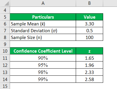 Let us consider the below example of 100 respondents surveyed for their customer service feedback. The survey was on a scale of 1 to 5, with 5 being the best, and the average feedback of the respondents was 3.3, with a population standard deviation of 0.5. Determine the confidence interval for the following data-