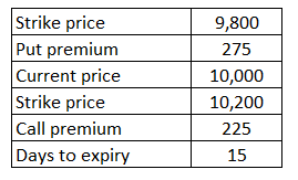 Let’s consider an example where the index is trading at 10,000. For our analysis, we consider two strike prices – one 200 points above the current spot price and one 200 points below the current spot price. The following table summarizes our scenario.