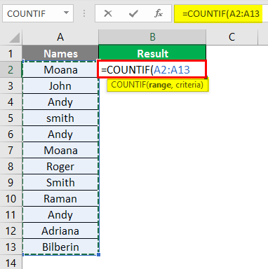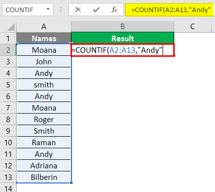 Now, use “Andy” as the criteria under the COUNTIF function. It allows a function to count the number of times “Andy” has occurred in the range of cells.