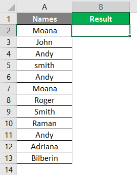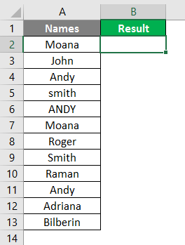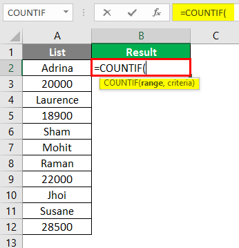 Now, we only want to find out how often the name “Andy” is occurring on this list. Start typing the COUNTIF formula in cell B2.