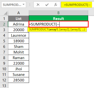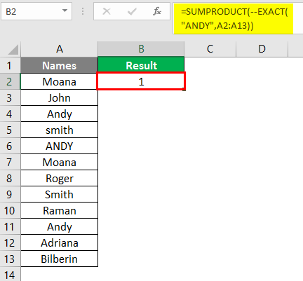 You want to find the count of “ANDY” (word Andy with all caps). This is a different scenario. Therefore, you must use SUMPRODUCT with the EXACT function to get your desired value. Start typing the SUMPRODUCT formula in Excel and add a double minus sign, as in example 2.