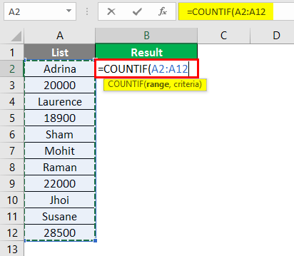 As the requirement of the COUNTIF function, set range as an array from A2:A12 as a first argument.