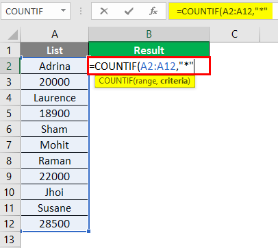 Example #1 – Count Cells in Excel using COUNTIF Function and the Wildcard Character