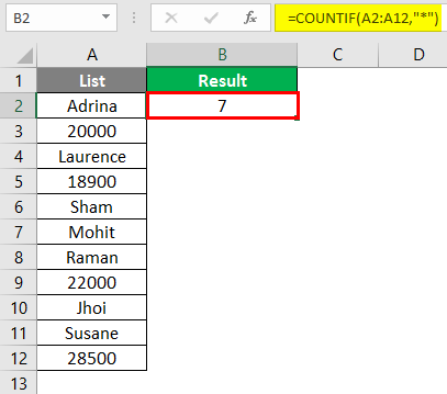You can see in cell C2; the number 7 denotes 7 text values in the range A2:A12. The key argument here is a wildcard asterisk. It allows the COUNTIF function to count any number of characters except numbers or logical values. You must also note that those will be counted in this formula if numbers are stored as texts.