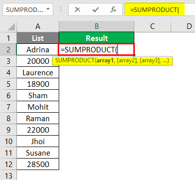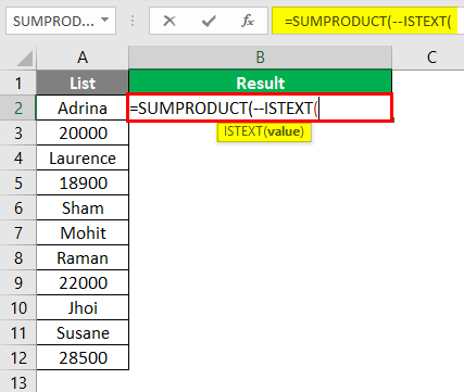 SUMPRODUCT, with the help of ISTEXT, also allows you to count the cells having text values in them. In cell B2, start typing the SUMPRODUCT formula.