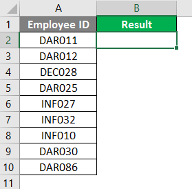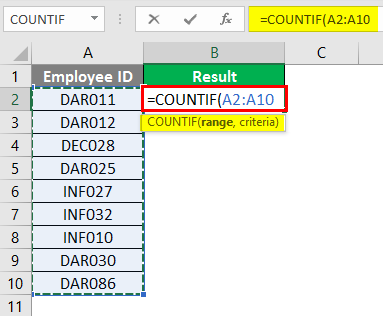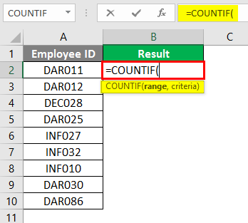 All we want is the count of Employee ID starting with “DAR”. Start typing the COUNTIF formula in cell B2.