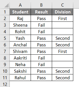 Students ‘Pass/Fail’ status is stored in column B. The result status according to marks, i.e., if it is ‘First Division’ or not, is stored in column C. The following formula tells Excel to return a count of students who has passed and scored ‘First Division’ marks.