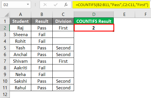 So we can see in the above screenshot that the COUNTIFS formula counts the number of students who meet both conditions/criteria, i.e., who have passed and scored ‘First Division’ marks. The students corresponding to the below-highlighted cells will be counted to give a total count of 2, as they have passed and scored ‘First Division’ marks.