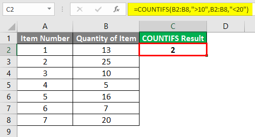 Let’s say we have two columns containing item numbers and their quantities present in a store. If we wish to find out the count of those cells or items whose quantity is between 10 and 20 (not including 10 and 20), we can use the COUNTIFS function below.