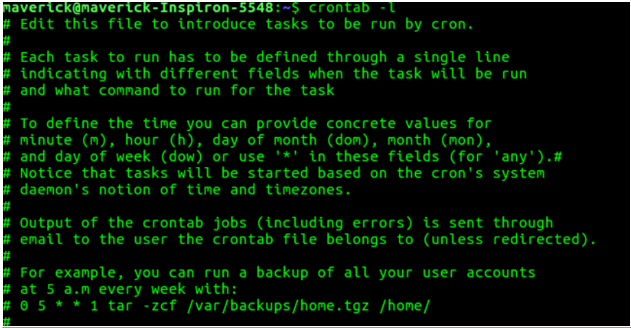 For instance, you can set up a cron job to automatically run a file on a weekly, monthly, or daily basis. If you need to take a database backup every day, you can use a cron job to execute a script specifically designed for that purpose. There is no need for manual running of the script. For example, to run the backup of user accounts at 5 A.M. Every week, the following command, shown in the below snapshot, must be used.